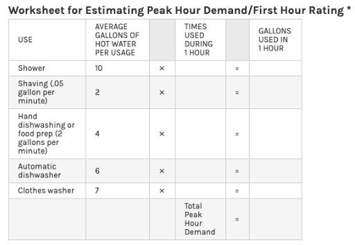 Now, to find the right size tank water heater based on your peak demand, you need to look for a water heater that has a first hour rating (FHR) within 1–3 gallons of that number. FHR refers to the maximum amount of hot water a tank water heater can produce per hour.